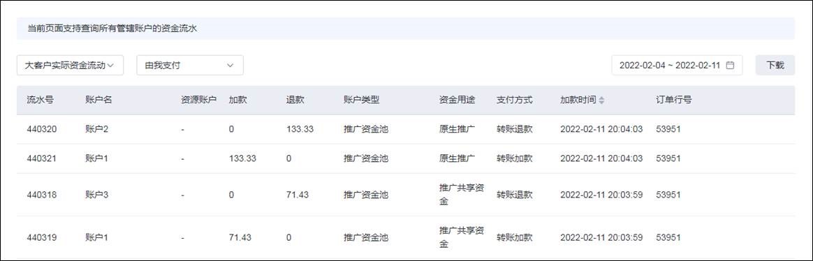 百度推广如何查询资金流水 百度推广如何查询资金流水 匿名用户 1346 次浏览04-17 提问 最佳答案 本回答由达人推荐 二级管理员可查看管辖账户的资金流水含余额转入、转出情况等。以KA为例,可查询内容范围如下图所示。 匿名回答 04-17 回答 其他非优质回答内容被隐藏