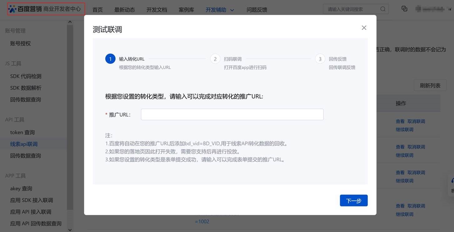 升级后:新创建的转化追踪,「转化配置状态」默认是未激活,必须联调成功后(转化配置状态是已激活状态)才可进行投放,点击联调后,跳转至商业开发者中心(目录:商业开发者中心-开发辅助-开发工具-ocpc工具- API工具-线索API联调)进行联调操作,示例如下: