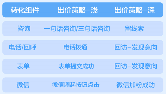 1.对于希望提升线索质量的客户,推荐使用浅层+深层的出价策略(搜索自动优化,信息流双出价);如果您不知道选什么,可以参考我们的推荐组合: