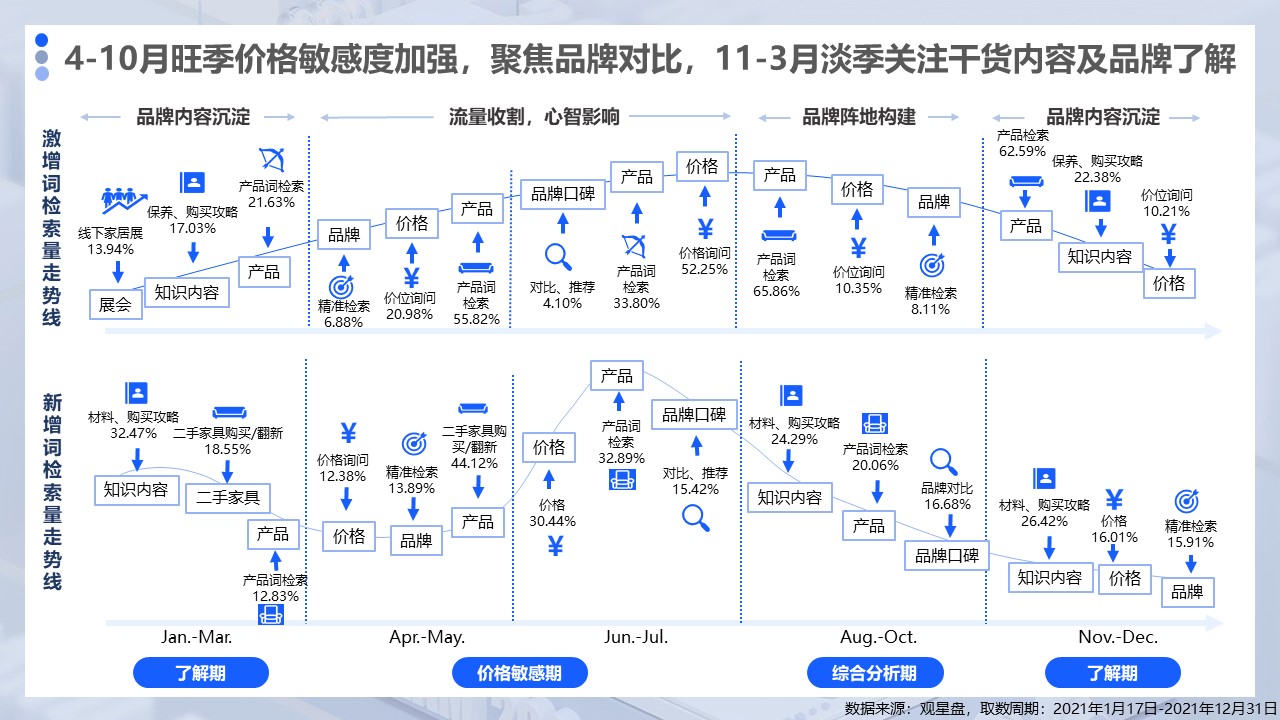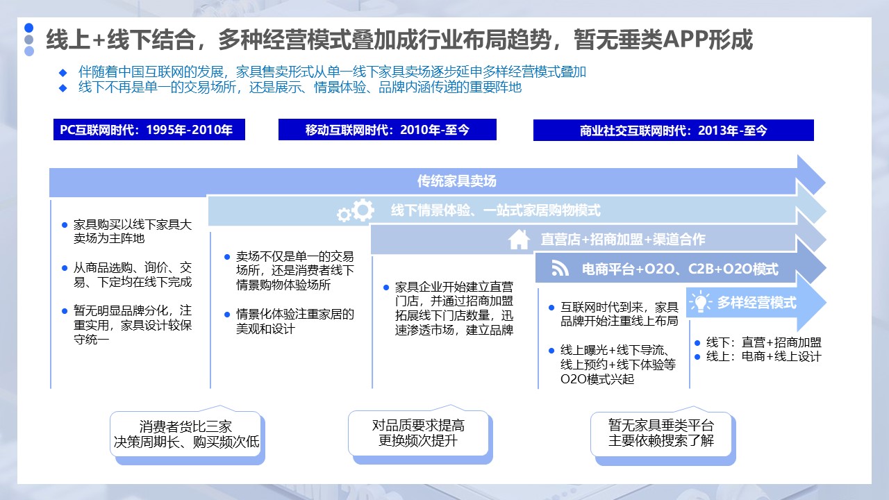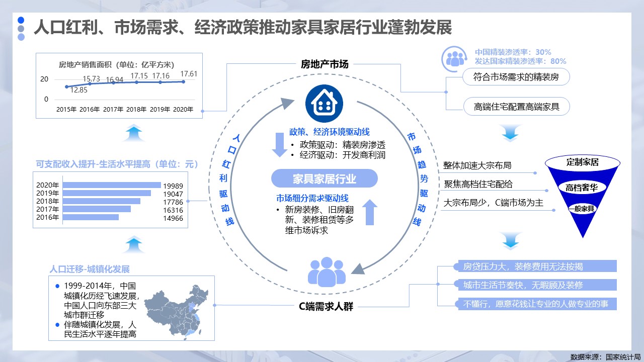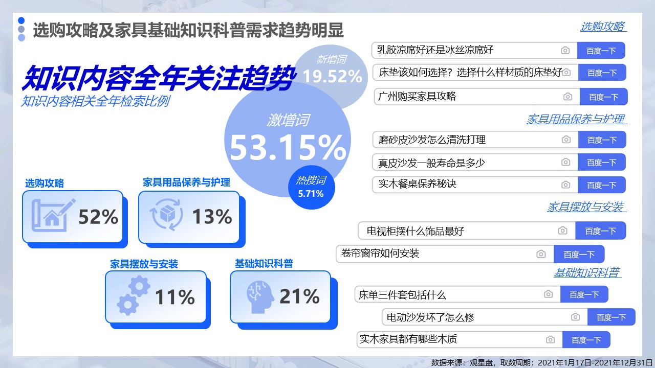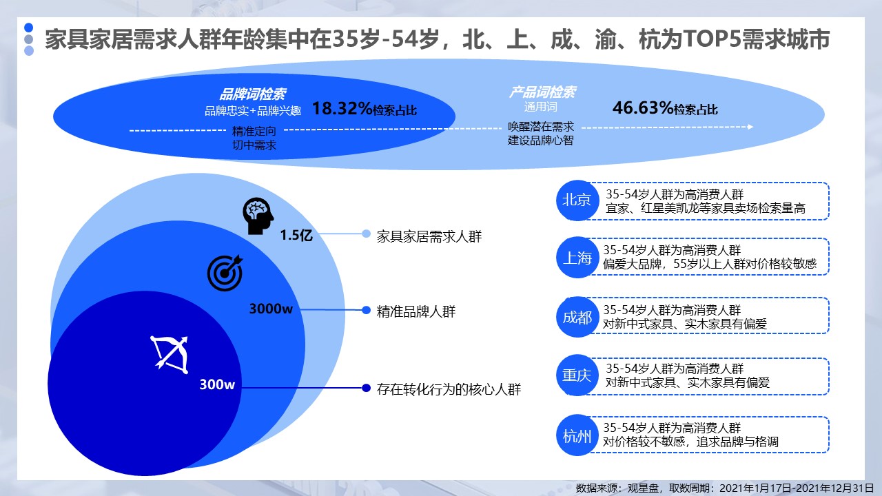 2021年家具家居行业洞察报告 发布时间:2022-04-06 阅读数:809 中国人口红利、城镇化发展及居民可支配收入的提高,造就了房产行业20年的蓬勃发展,作为房产行业的下游产业,家具家居行业格局也在时代浪潮中变革不断。本报告为百度穗莞产品策略中心与观星盘联合输出,洞察用户行为,助力家具品牌完善全方位营销布局。